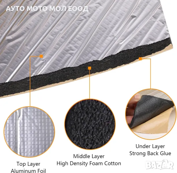 Шумоизолиращо фолио, което може да се постави на врати, капаци, подове и други части от каросерията на автомобила. Фолиото изолира шума вътре в купето, подобрява акустиката от аудиосистемата и създава по-голям комфорт на пътниците при пътуване. Шумът от вибриращите елементи по купето, могат да предизвикат главоболие и умора с помощта на шумоизолиращото фолио шума се намалява до 40-50%.