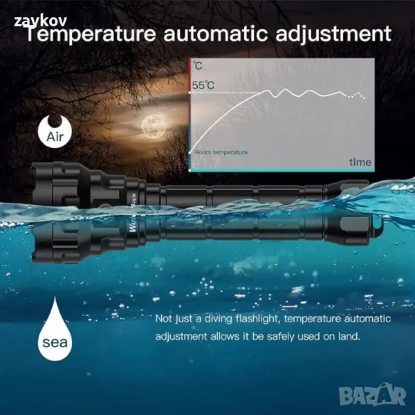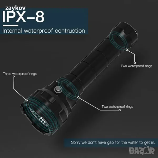 Водоустойчив клас IPX-8: Този професионален фенер за гмуркане има ниво на водоустойчивост IPX8, 150 метра под вода, много подходящ за начинаещи и професионални водолази, подводни спортове, независимо дали гмуркане, катерене, риболов, разходка с лодка, туризъм, пътуване, нощни разходки и др. Ако го използвате на сушата, той е по-водоустойчив от повечето фенерчета.