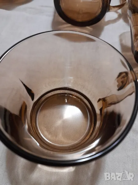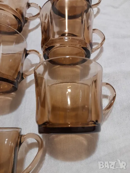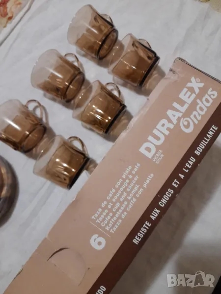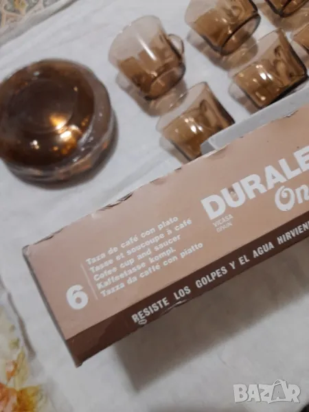 Стар сервиз за кафе-Дуралекс Испания комплект от 6 бр.чашки и чинийки.Състояние чисто нови не са използвани видно на снимките, Единствена забележка няма го капака на опаковката. Вместимост о/о 200 мл.