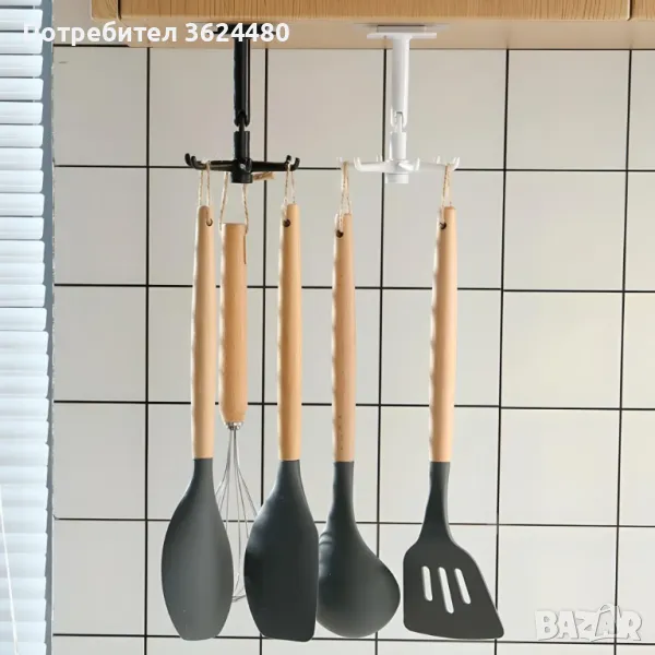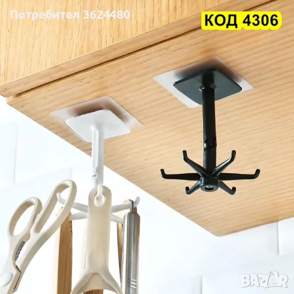 Със своите компактни размери от 6х6 см за основата и дължина на всяка кукичка от 3 см, въртящата закачалка е перфектна за малки и големи кухни. Височината от 5.5 см осигурява стабилност и удобство при използване. Тази закачалка е създадена да издържа до 5 кг, което я прави подходяща за разнообразни кухненски инструменти и аксесоари. Лесно се монтира на всякакви гладки повърхности, което я прави изключително универсална.