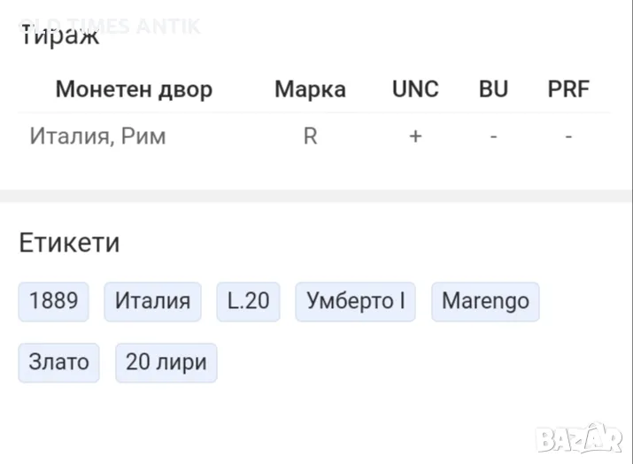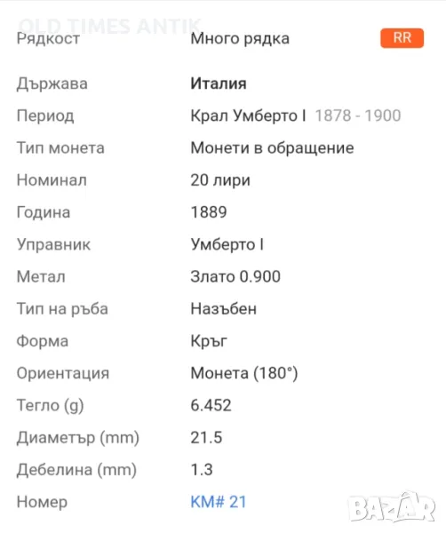 Златна монета 20 ЛИРИ 1889 RRR !!!!! НАЙ РЯДКАТА ! → Обява 46842287