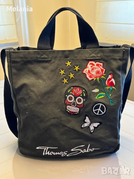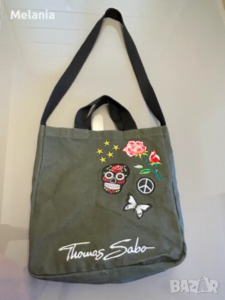 Към нея – текстилна чанта Thomas Sabo, в сиво-зелен цвят, с две къси и една дълга дръжка.