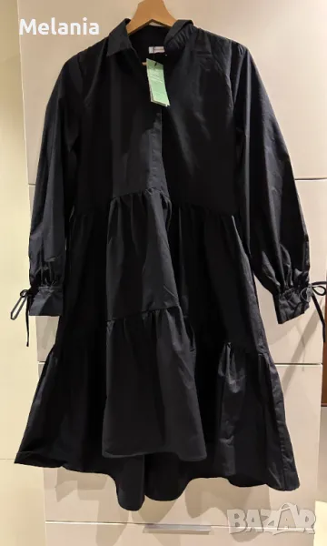 Черен цвят, свободна кройка, разкроява се надолу, асиметрична – отзад е по-дълга, с интересни детайли на ръкавите-връзки. Фирма Reserved.