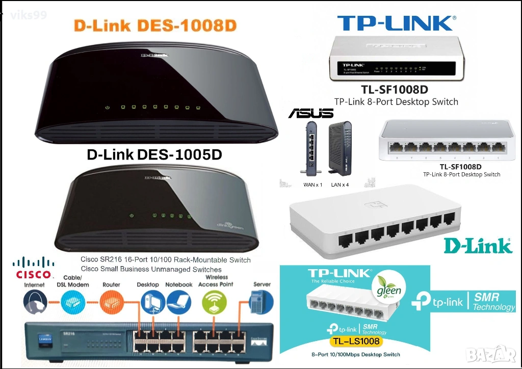 Суичове 5 и 8 портови TP-Link, D-Link, Linksys, ASUS → Обява 46842990