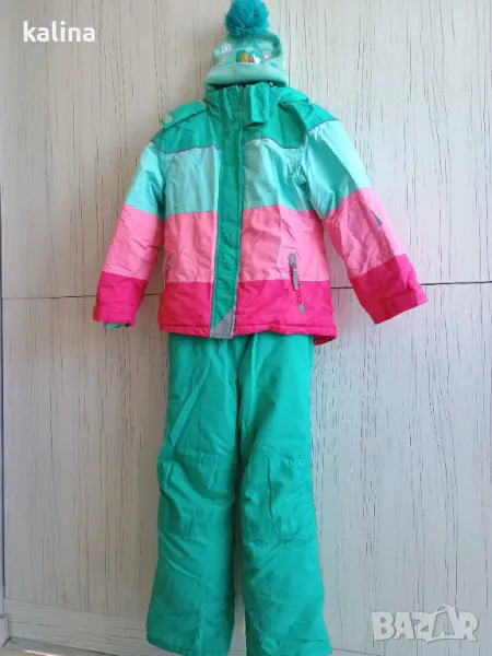 Детски ски екип и шапка в отлично състояние без забележки.Купуван е от Германия.Екипът е много плътен и няма нужда да се носи Термо бельо отдолу.Размер-128см