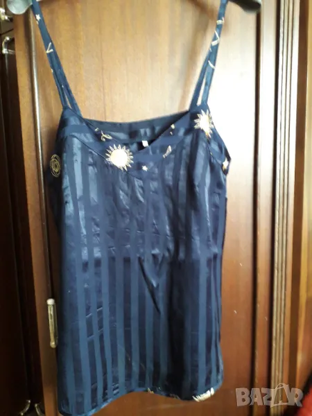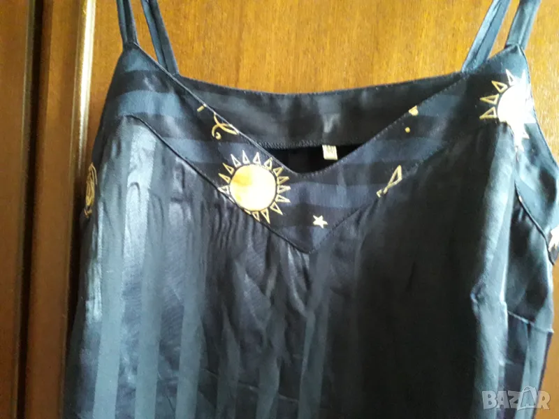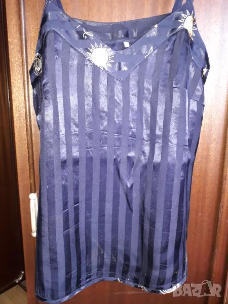 Дамски потник с тънки презрамки от сатен, тъмносин цвят с жълти луни и звезди около деколтето. Размер 44 или М. Отговварям на съобщения тук, изпращам с куриер с отстъпка, преглед и тест или лично предаване в София.