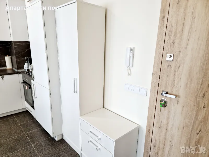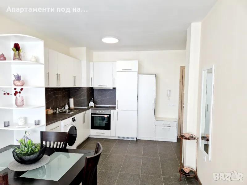 Апартаментът е с изложение запад , напълно обзаведен с мебели в модерен стил! Състои се от дневен тракт с разтегателен диван за 2 души , разтегателен фотьойл за човек, трапезария, оборудвана кухня , вграден хладилник, фурна, индукционни котлони, мощен аспиратор. В апартамента има 1 спалня с двойно легло за 2 души. Апартаментът предлага 1 бр баня/тоалет, коридор . Слънчева западна тераса с градинска мебел!