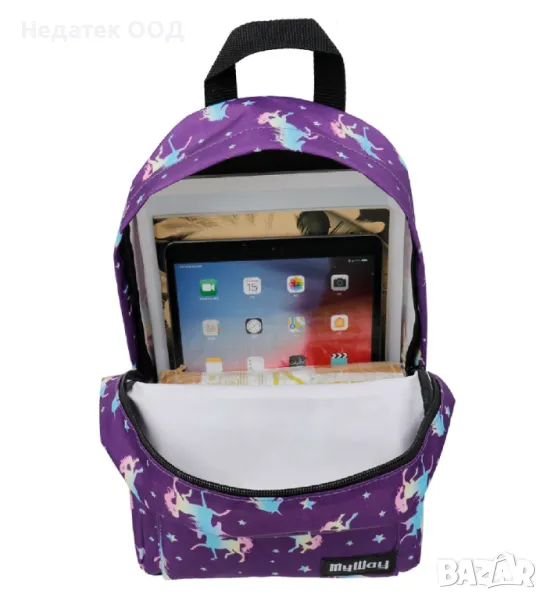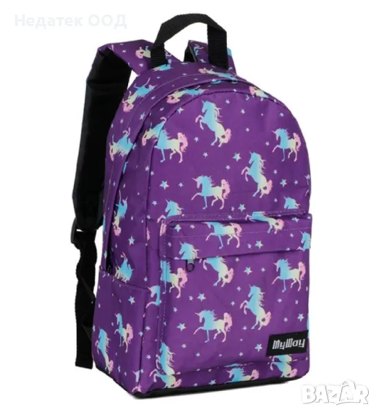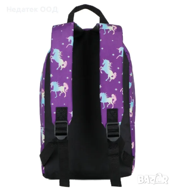 Ученическа чанта - раница за детска градина за момичета, лилава с шарки на еднорог. Има 1 голямо отделение и външен джоб с цип, регулируеми презрамки, мек гръб и дръжка за носене.