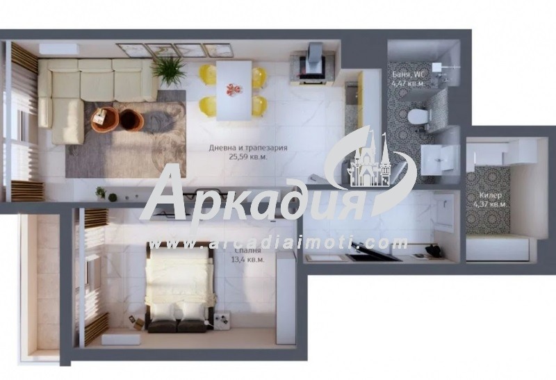 Аркадия недвижими имоти Ви предлага ДВУСТАЕН АПАРТАМЕНТ в новоизграждаща се луксозна сграда, разположена в кв. Хр. Смирненски.