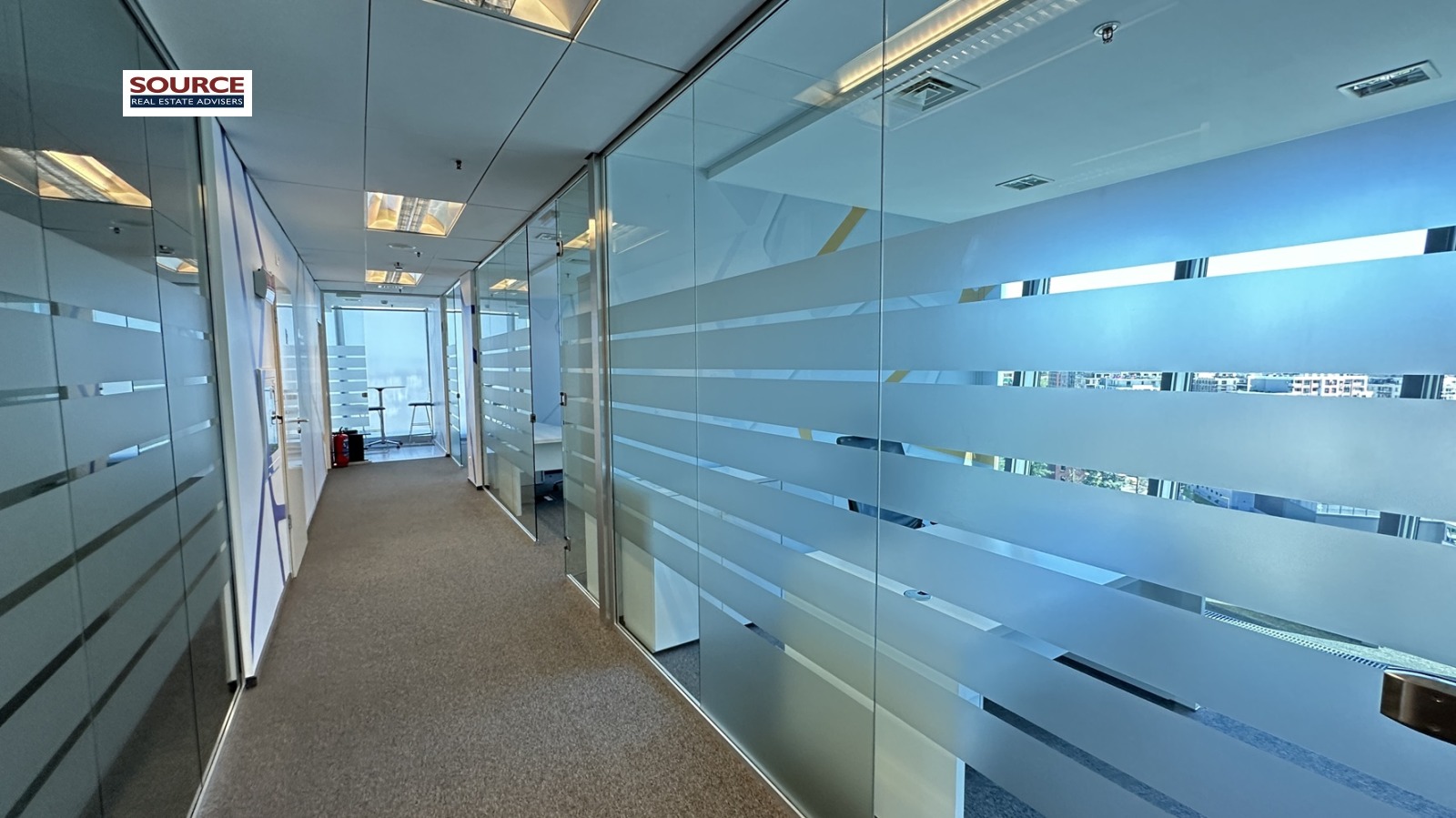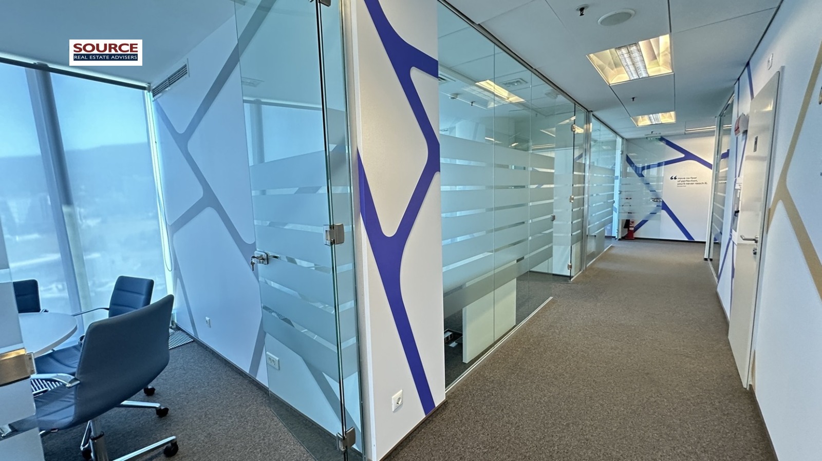 2. Разпределение: 7 отделни помещения преградени със стъклени и гипсокартонени преградни стени, оборудвана кухня, рецепция, сървърно помещение, 3 wc. Офисът може да бъде изцяло с Open space разпределение или допълнително преграден според изискванията на Наемателя.