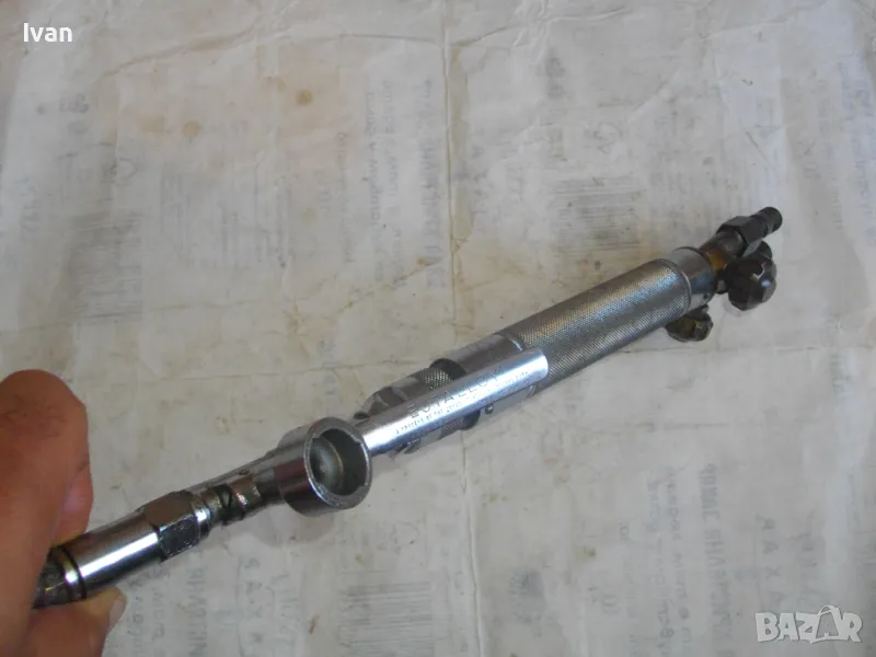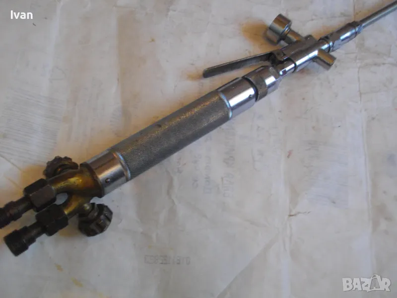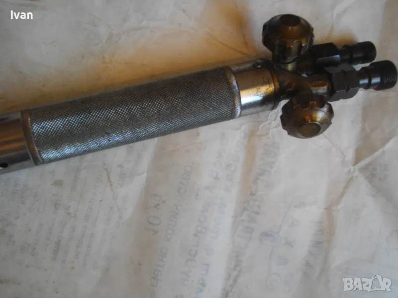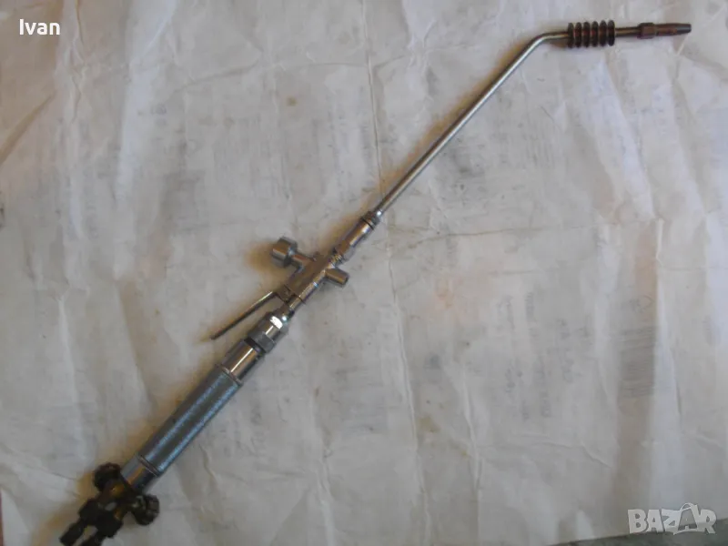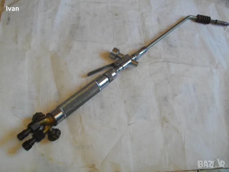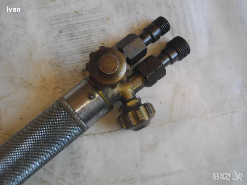 Масивна стоманена дръжка от инокс неръждавейка, 2 въртока/врътки от бронз, бронзови щуцери, 2 извода отзад, стомана предна част глава8тяло, оловно-цинкова тръба с медна контактна дюза с 1 голям отвор. Тръбата над контактната дюза е с медно оребряване /холендър/ против разширяване на тръбата при работа с висока температура. Резака е почти нов, много малко използван.Serial Number E 1333.