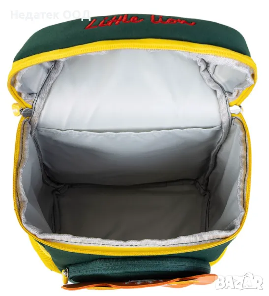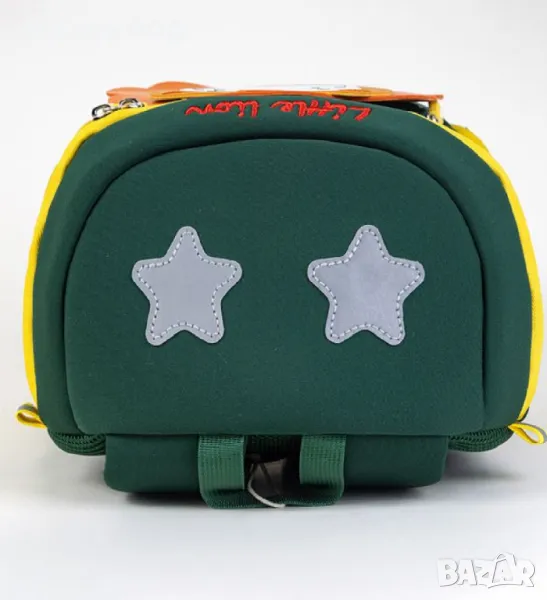 Ученическа раница за детска градина, зелена с дизайн на лъв с две звезди в горната част и надпис "Little lion". Има 1 голямо отделение и голямо отделение, преден джоб с цип и 2 странични джоба с мрежа.