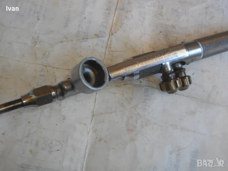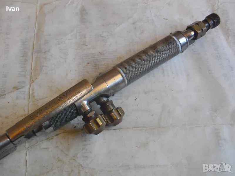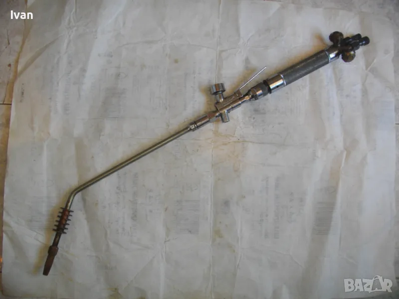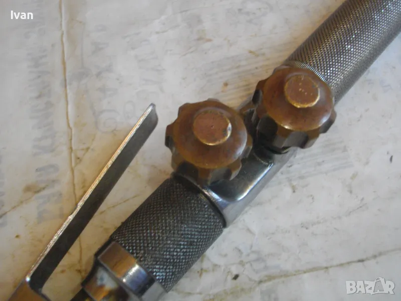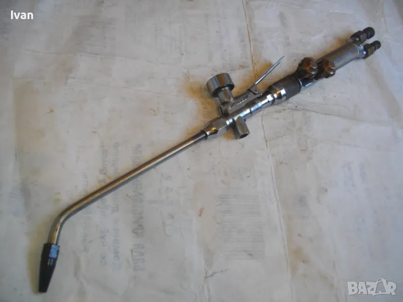 Масивна стоманена дръжка от инокс неръждавейка, 2 въртока/врътки от бронз, бронзови щуцери, 2 извода отзад, стомана предна част глава8тяло, оловно-цинкова тръба с медна контактна дюза с 1 голям отвор. Резака е почти нов, много малко използван.Serial Number E 1333.