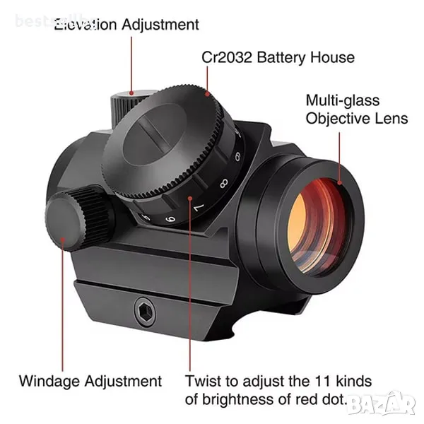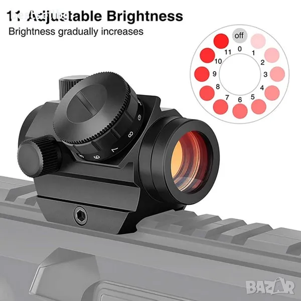 - Регулируема яркост: 11 нива на яркост на червената точка ви позволяват да адаптирате мерника към различни условия на осветление.