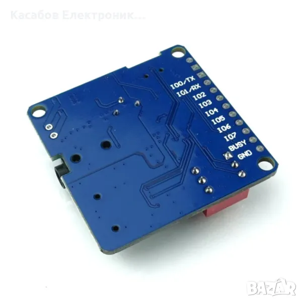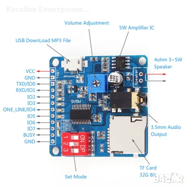 Благодарение на вградения усилвател можем директно да свържем високоговорител 4 ома 3~5W. Модулът поддържа карти памет във формати FAT16 и FAT32 до 16GB. Има microUSB порт, който ви позволява да качвате файлове на картата памет.