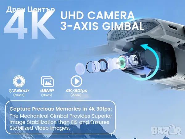 Дронът разполага с 3-осна система за стабилизация (наклон, люлеене, отклонение) , която гарантира стабилни и гладки записи дори при движение. Диапазонът на въртене на гимбалa е от -90° до +30° , а максималната скорост на управление е регулируема между 5°/s и 100°/s . Точността на ъгловото управление е ±0.01° статично, ±0.02° динамично , а стабилизирането е на ниво ±0.01° .