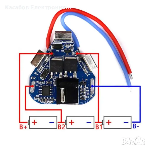 BMS 3S модул за ремонт на батерии в електрически инструменти като винтоверти или бормашини, състоящи се от 3 литиево-йонни клетки с моментен разряден ток до 40A и продължителен работен ток от 8A. Благодарение на него батерията няма да бъде разредена или презаредена до опасни нива, които могат необратимо да я повредят или да доведат до нейната експлозия. Модулът няма балансьор, но е снабден със защита от свръхток и късо съединение за веригата на свързаното устройство. Модулът има DC букса за директно, удобно свързване на зарядното. Технически характеристики: