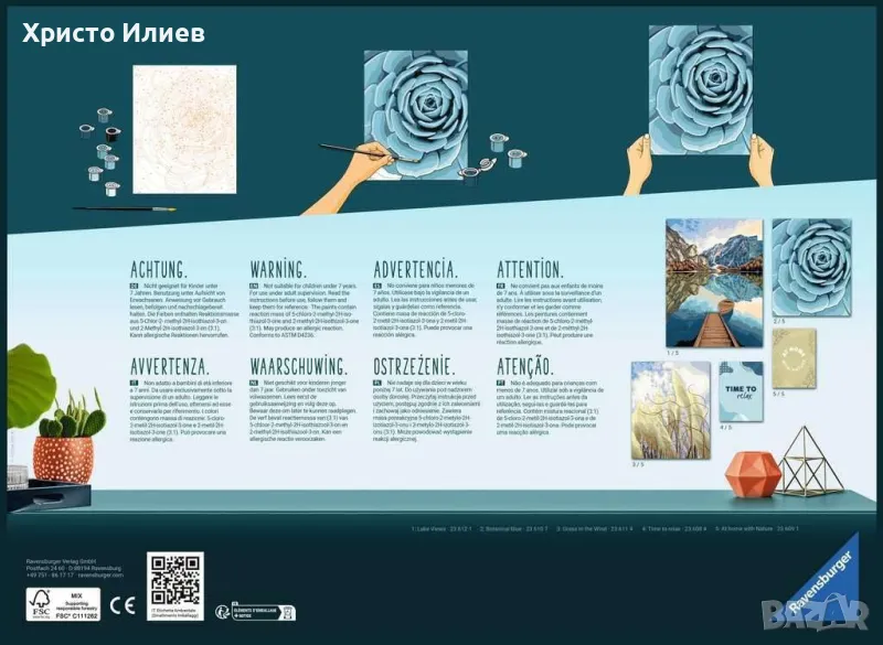 Готини мотиви, ярки цветове и лъскав лак за перфектен завършек. Модерният мотив трева във вятъра осигурява страхотно забавление при рисуване за възрастни на 12 и повече години. Линиите на мотива са вече отпечатани и номерирани и са готови за рисуване със смесените акрилни бои. Това е забавно рисуване с гарантиран успех за уникална декорация на стена. Рисуването никога не е било толкова лесно! Намерете своя път към вътрешния мир и релакс с CreArt - рисуване по номера от Ravensburger. Просто разопаковайте и започнете да рисувате: всеки комплект за рисуване съдържа всичко необходимо за рисуване и няма нужда да смесвате цветовете. Готовата нарисувана картина е подходяща като модерна декорация във всеки дом. Серията Ravensburger CreArt - Paint by Numbers предлага голям избор от мотиви за деца и възрастни.
