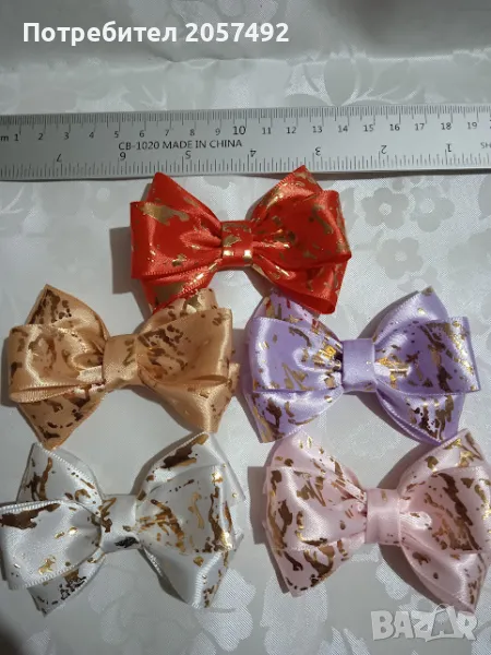 Готови панделки за декорация от сатенени ленти със златен принт. Предлагат се в 5 цвята - бяло, злато, розово, червено и лилаво. Могат да се изработят в три размера, съответно: