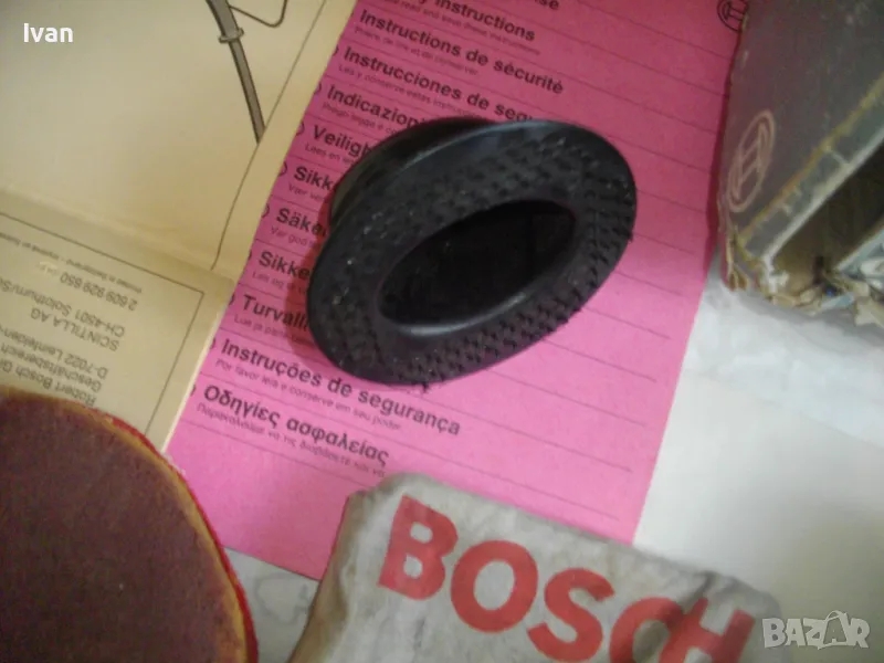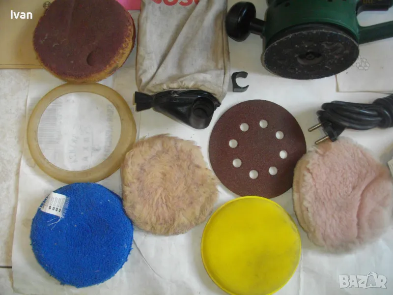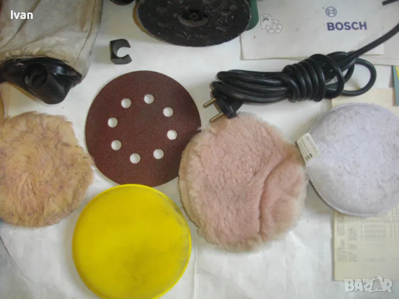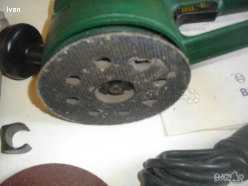 Работна пита/плот - сменеям размер ф 115 мм. Машината е с поставен орогинален почти нов плот БОШ тип Велкро ,със самозалепващи елементи, които са като нови и държат задраво приставки, шкурки и кечета.