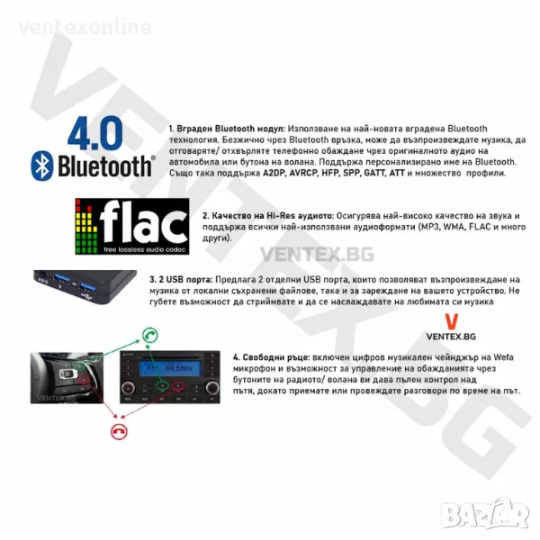 Ventex.bg предлагаме голямо разнообразие от Bluetooth модули, аудио адаптери и мултимедии за повечето широкоразпространени и популярни марки автомобили като Audi, Bmw, Mercedes, Volkswagen, Skoda, Seat, Peugeot, Citroen, Renault, Toyota, Honda и още много други. С нашата помощ ще можете да изберете подходящия адаптер за вашите цели. Може да се свържете с нас като изпратите съобщение или се обадите на посочения номер.