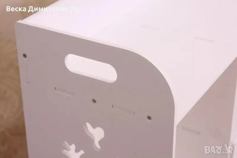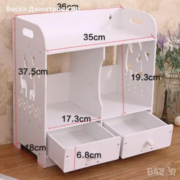 Материал: Дървесно-пластмасов композит, който осигурява здравина и устойчивост на износване. Този материал е също така екологичен и устойчив на влага, което го прави подходящ за различни помещения, включително баня; Цвят: Бял - универсален и стилен цвят, който се вписва лесно във всеки интериор; Дебелина на дъската: 5 мм - осигурява нужната здравина и стабилност на шкафа, без да го прави тежък и масивен; Размери: 37.5 х 36 х 18 см - компактни размери, които позволяват лесно поставяне на различни места в дома ви, като същевременно осигуряват достатъчно място за съхранение на вашите вещи.
