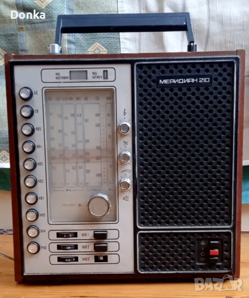 Продавам радио "Меридиан 210". РАБОТЕЩО. Много добър външен вид. Прибираща се телескопична антена 80 см на сглобка тип "ябълка" (стАвна въртяща се сглобка във всички посоки без ограничители). Може да работи на 220 волта, а също и на комплект от шест батерии. С една дума - има си всичко и стои доста елегантно в интериора. При мен не лови УКВ, слушам една румънска станция на дълги... Само лично предаване - София, центъра до НДК. Цената е с предварителен коментар.