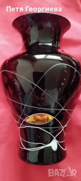 Тъмно винена ваза с много фин бял рисунък и златни фигурки от трите страни. Височина 13,5 см.