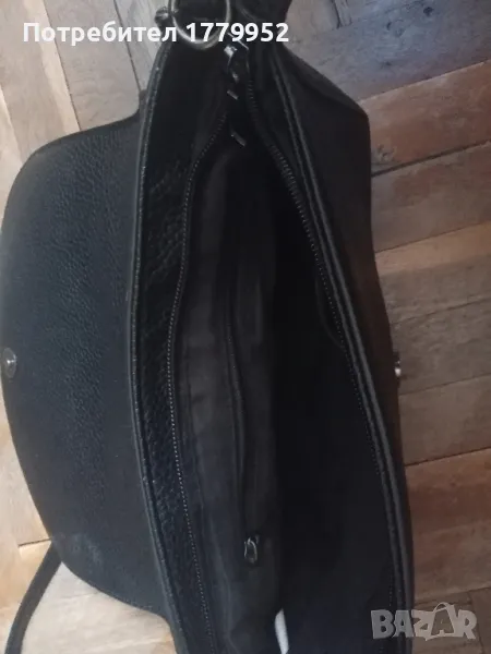 Черна дамска чанта с верижка за рамо. Размери - височина 15 см., дължина 22 см., дъно 6 см. Отвътре има две джобчета, едното с цип. Има леки следи от употреба, но е запазена.