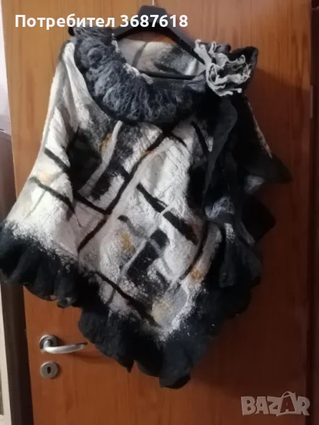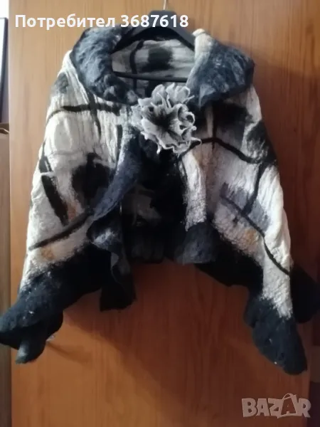 Красиво наметало от плъстена вълна с размери 140/ 70см. Може да се използва като шал, наметало, пончо.Българска, ръчна ,занаятчийска изработка. Заради художествените му достойнства може са се използва като пано за стена и др.