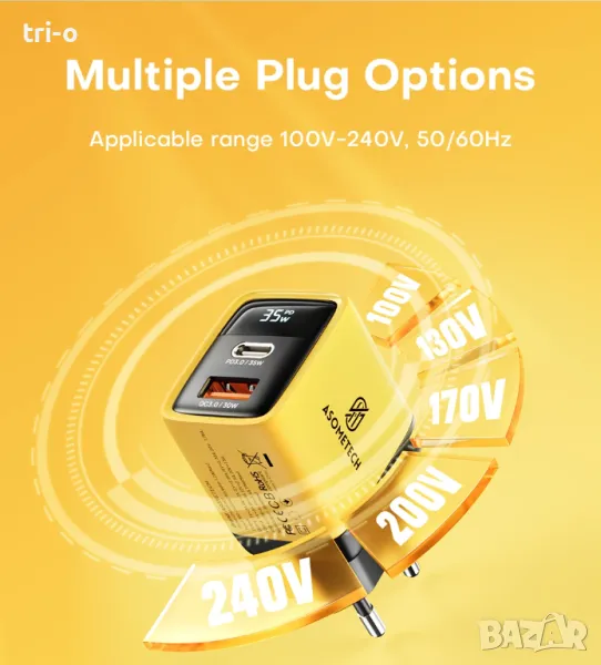ASOMETECH 35W GaN Зарядно устройство USB + Type-C цифров LED дисплей QC3.0 Бързо зареждане.