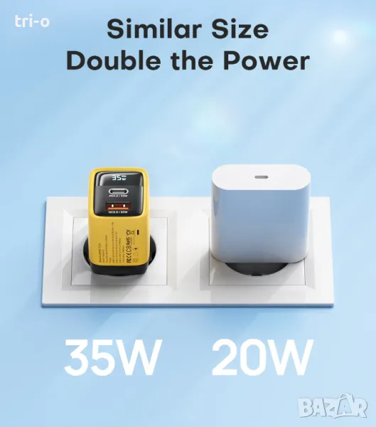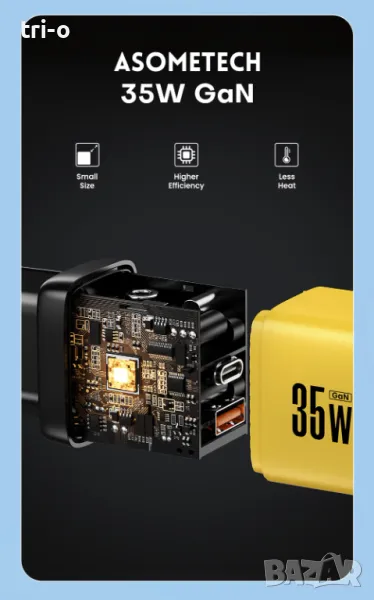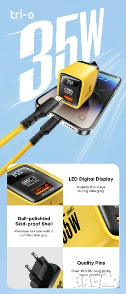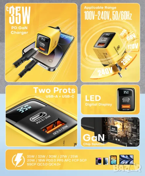 • GaN технология: Зарядното устройство използва GaN технология, което го прави по-малко и по-ефективно от традиционните зарядни устройства.