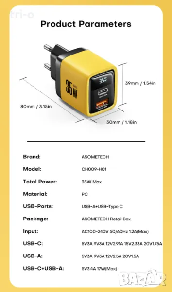 Asometech 35W 2-портово USB тип C зарядно устройство за стена