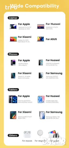 Възможността за бързо зареждане на зарядното е свързана с модела и версията на софтуера на устройството. Софтуерните надстройки на устройството може да повлияят на съвместимостта на бързото зареждане на зарядното устройство. При реална употреба продуктът действително ще бъде съвместим с повече модели, тъй като има твърде много модели устройства.