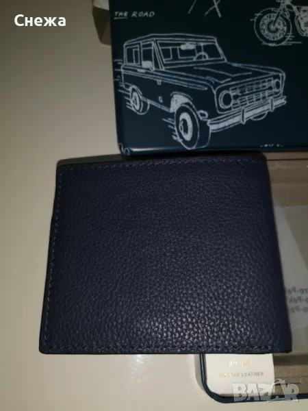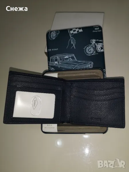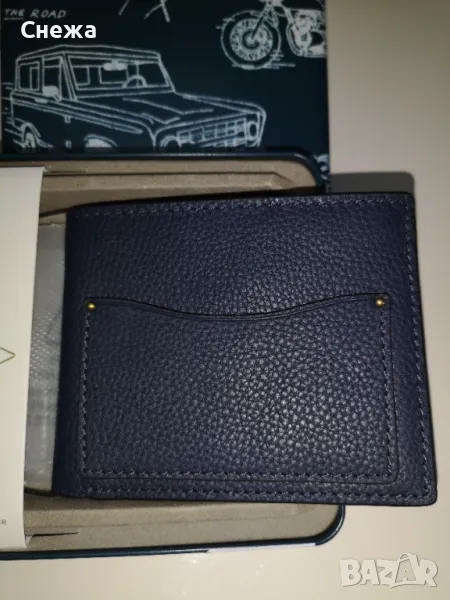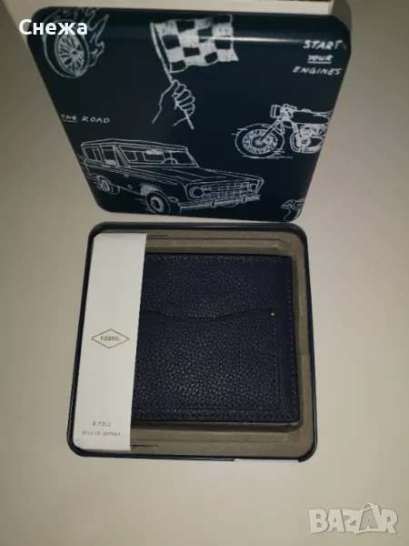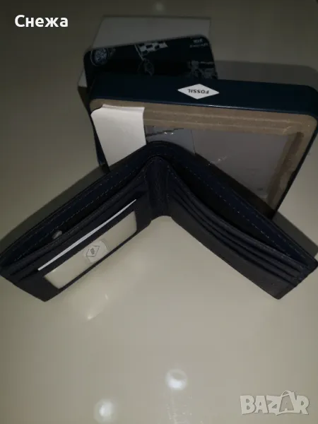 в оригиналната си метална кутия. Оригинален е на фирмата Fossil с номер на модела Ml4577406. Портфейла е изработен от тъмно синя леко зърнестта естествена кожа, която е изключително мека и приятна на