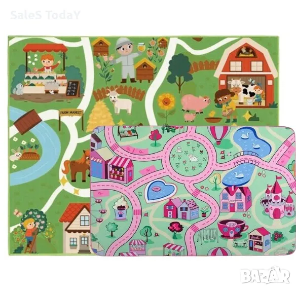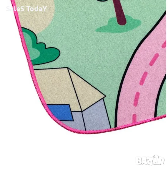 Декоративен правоъгълен килим, розов с шарка на селски път и противоплъзгаща повърхност на дъното.