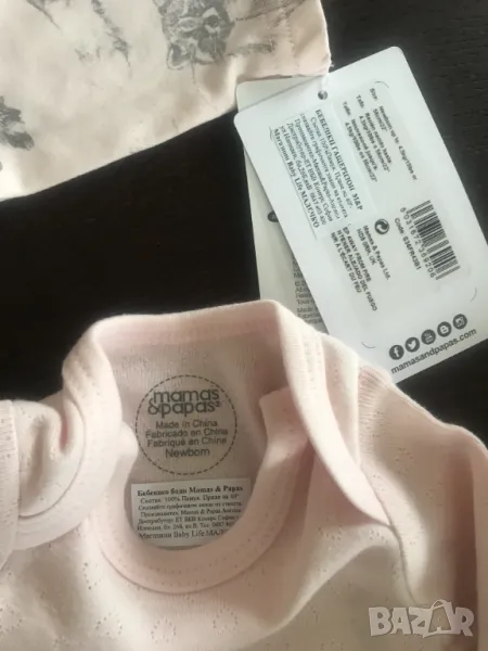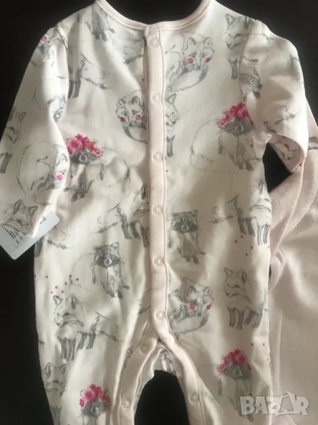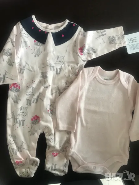2/ Mamas & Papas - комплект гащеризонче и боди с дълъг ръкав за новородено. Гащеризончето е със задно закопчаване, бледо розово с графитени рисунки на живтони, тъмно синя имитация на якичка. Бодито е бледо розово, със сърчица (ненарисувани, а част от плетката). Памук 100%. Двете заедно - 9 евро.