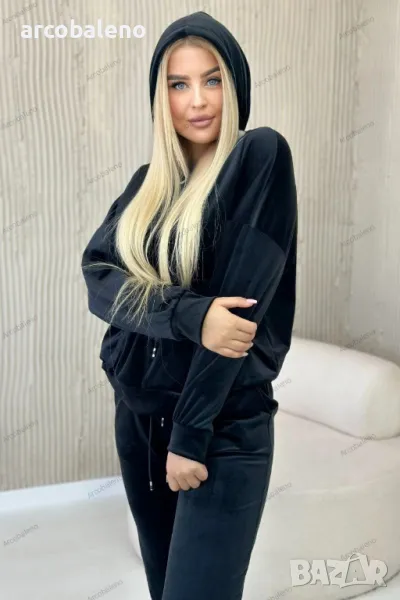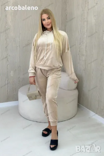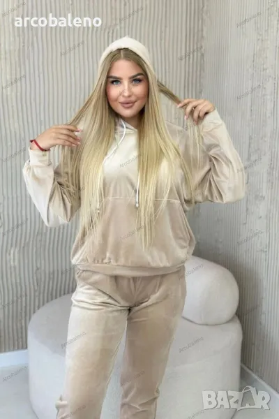 Дамски велурен комплект суичър кенгуру + панталон, 2цвята