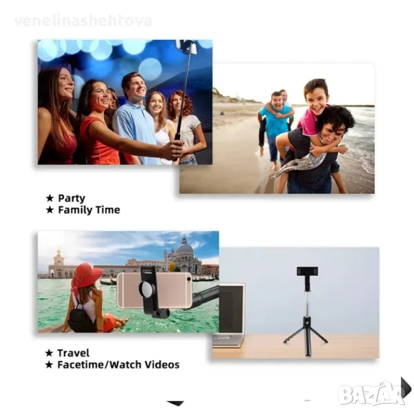Повече от обикновен селфи стик, това е универсален мини статив/трипод, голям статив/трипод и страхотен селфи стик с уникален дизайн и перфектно качество, има Bluetooth дистанционно, позволяващо ви да правите снимки дистанционно на разстояние до 10 метра.