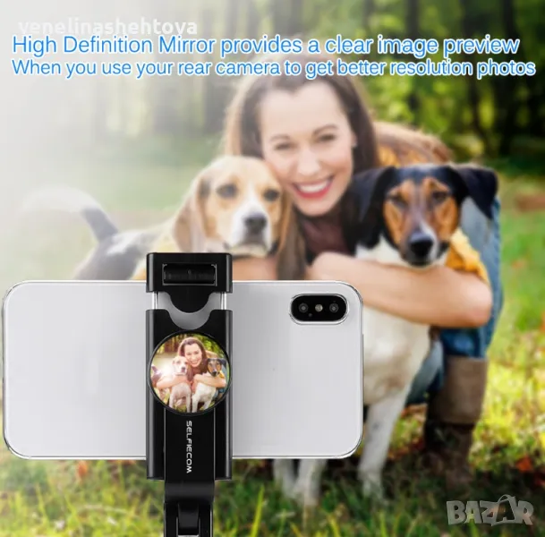 Селфи стика има опця използване на задна камера на вашия смартфон, с помоща на малко кръгло огледало закрепено на селфи стика.