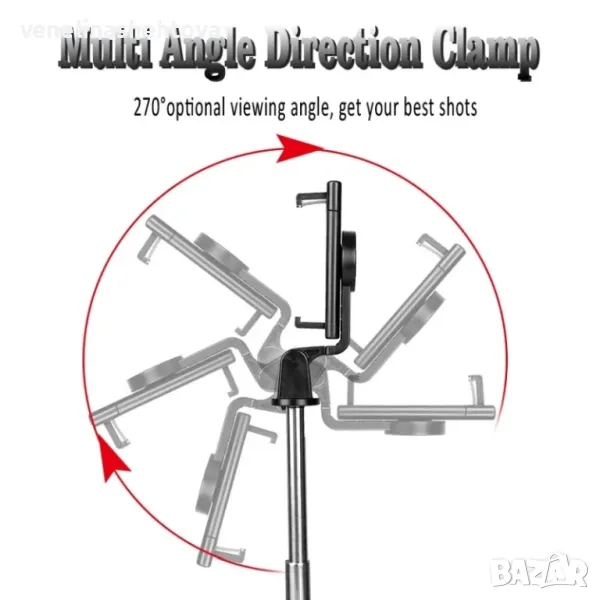 натиснете бутона, за да заснемете снимка. Стойката която захваща телефона се разтяга до 8.5 см, така може да захване доста модели телефони на тясната им страна, стойката може да се извива в множество посоки.