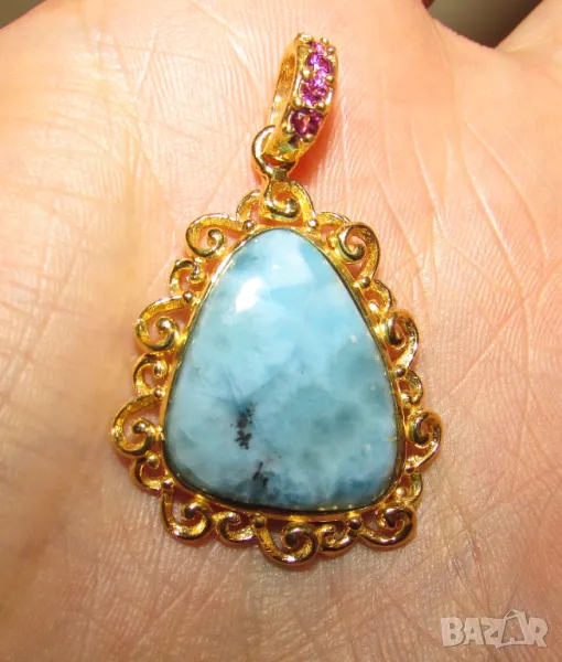 925 сребърно колие с ларимар 12 карата, размер 39x25x7мм, общо тегло 6.1гр. Произход Доменикана, другите камъни са родолит. Златно поокритие. Цена 150лв.