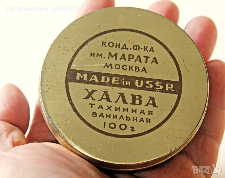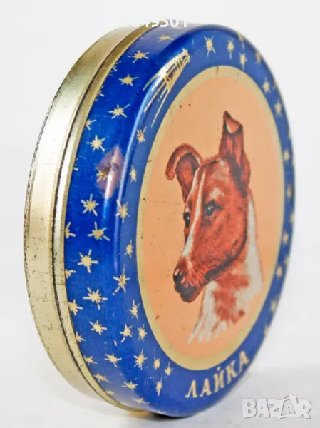 1957ма год. Ламаринена кутия от халва с образа на кучето Лайка летяло в космоса, Над образа на кучето е изобразен спътника Спутник 2. Производител Сладкарска фабрика МАРАТ - Москва.