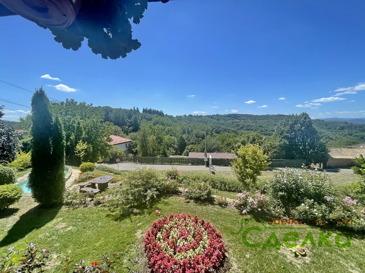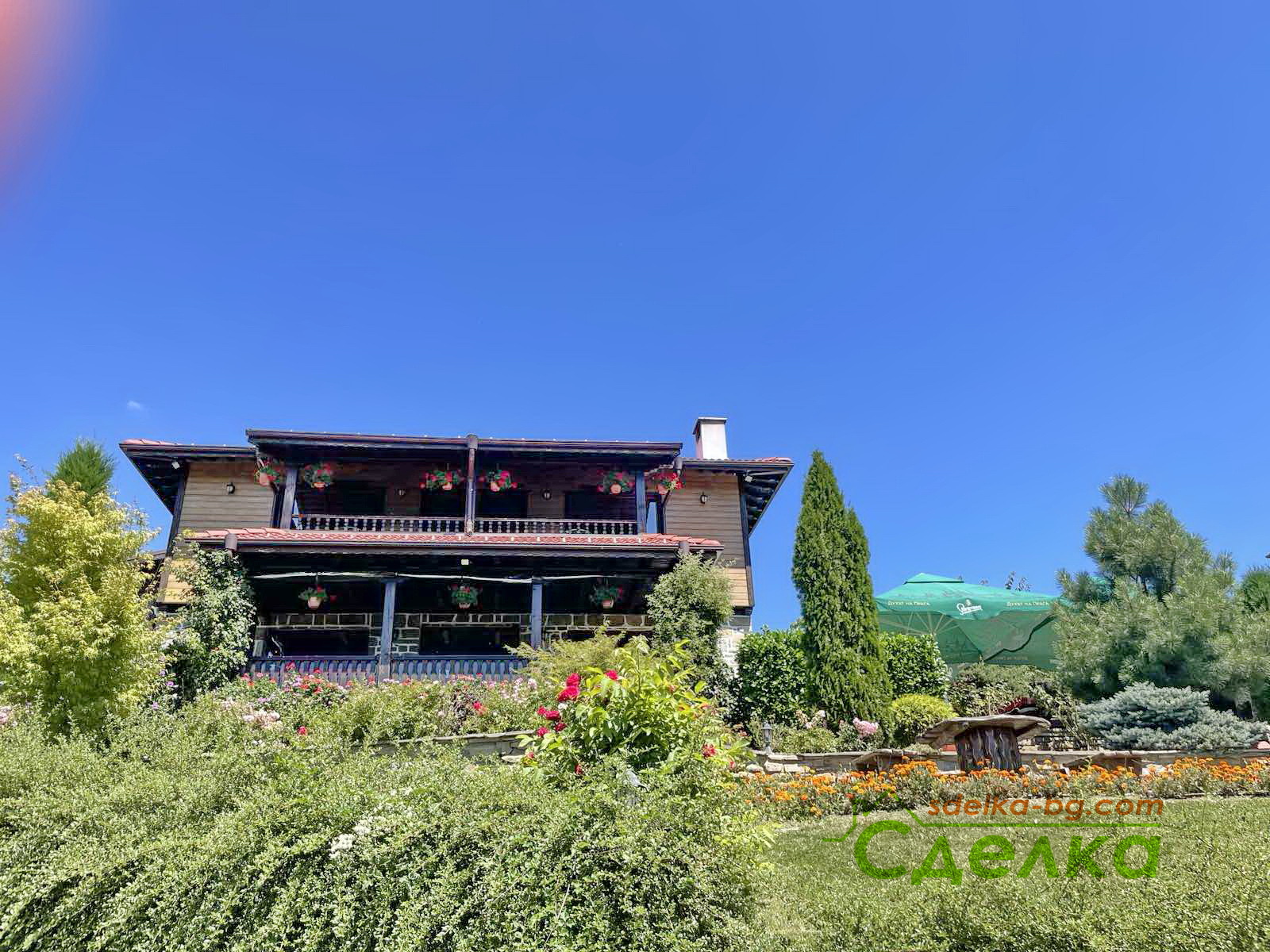 СДЕЛКА Ви предлага разработен хотелски комплекс за гости с красива панорамна гледка към връх Ботев и билото на Стара планина. Имота се намира близо до красивия възрожденски град Трявна и е разположен сред много зеленина над 600 м надморкса височина. При изграждането на комплекса е запазен традиционния български стил, с големи тераси и веранди, като са използвани изцяло камък и дърво. Къщата е хидро и топло изолирана с отлично отопление и климатизация. Разгърнатата застроена площ е 325 кв.м, които са разпределение между два етажа свързани с вътрешно стълбище. Първия етаж е с площ от 178 кв.м и се състои от голяма дневна с камина, изцяло оборудван кухненски бокс и трапезария, веранда, санитарни помещения и склад. Вторият етаж се състои от четири спални със санитарни възли и панорамни тераси. Къщата се продава с цялото налично обзавеждане и оборудване. Имота включва 1450 кв.м дворна площ заедно с построените в него къща, басейн с джакузи и барбекю с чеверме, което се задвижва чрез водно