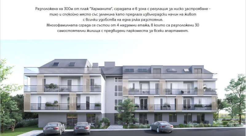 Сградата се намира на около 200-300 метра от прекрасния плаж 'Харманите', в близост до главната улица на Новия град, където има разнообразие от магазини и приятни заведения.Сградата е с предстоящ Акт 14.Апартаментите са със степен на завършеност, както следва: