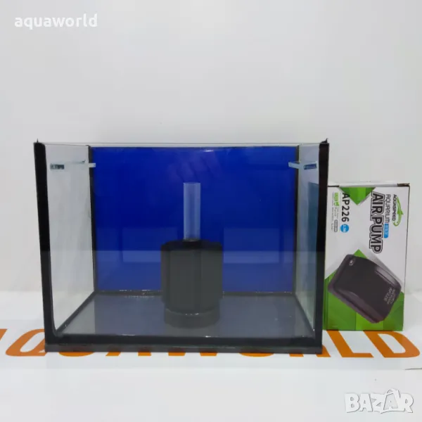 Аквариума може да бъде окомплектован с филтър - гъба с тежест, машинка за въздух, лампа и шлаух 1м.