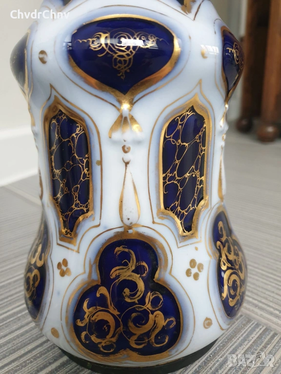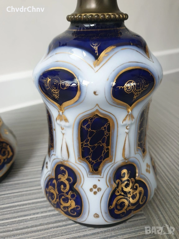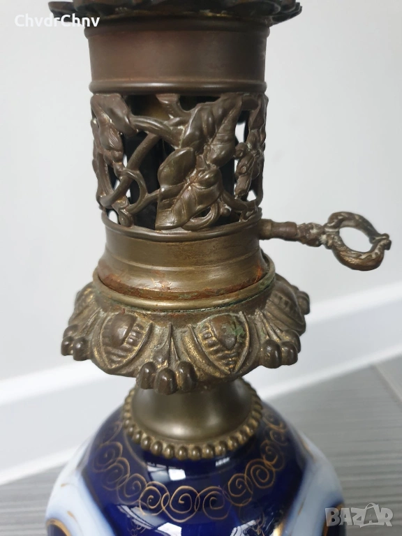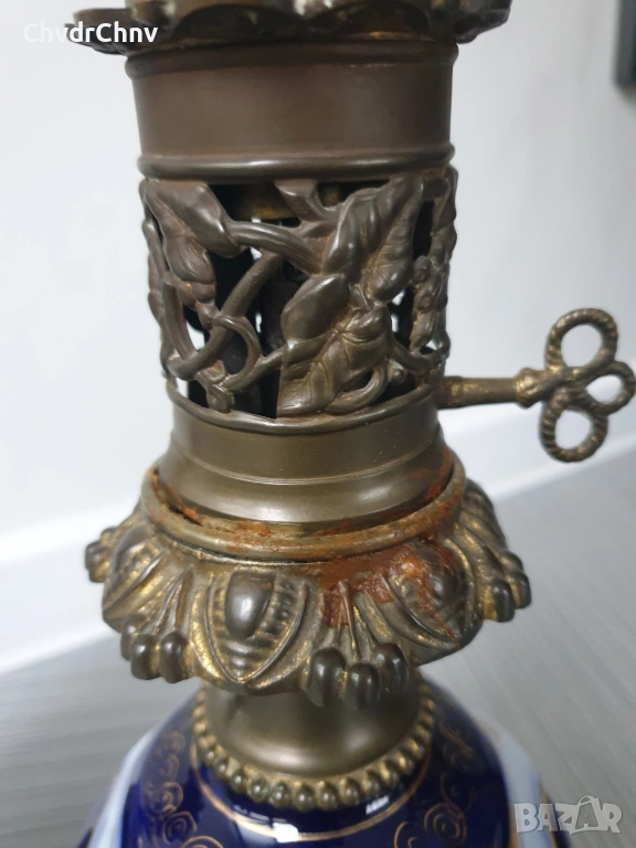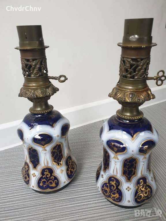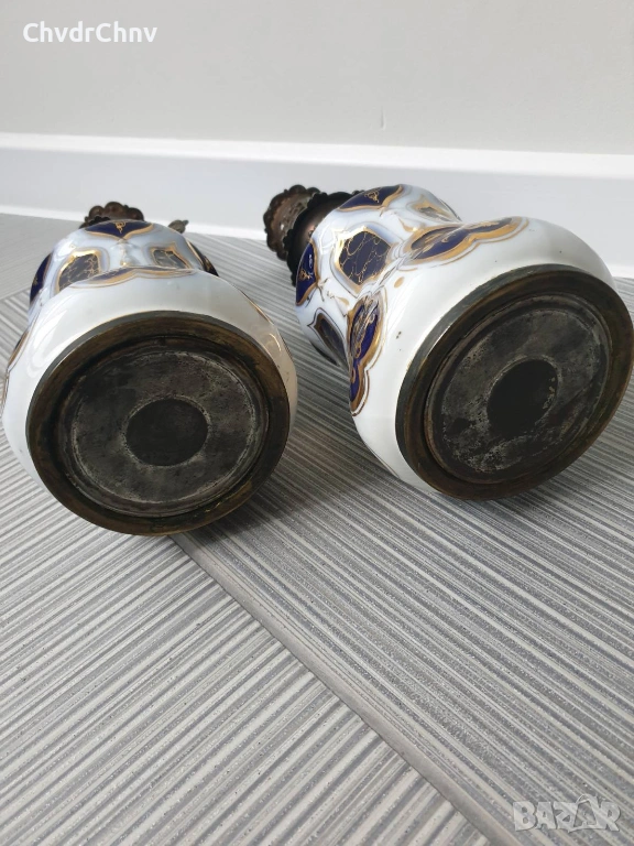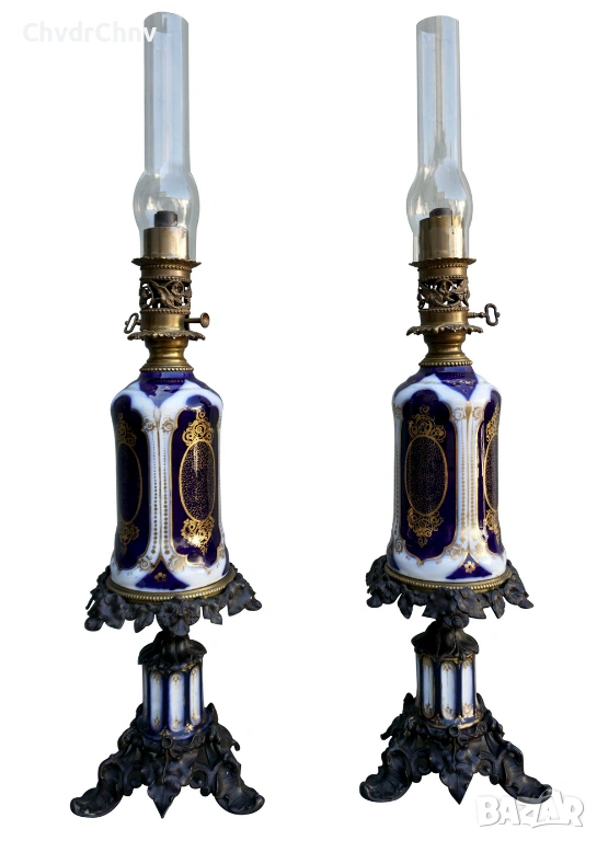Лампите са от порцелан (резервоара), ръчно оцветен в кобалт синьо и злато, с елементи от бронз (системата за регулиране дължината на фитила) и със стъклени комини (не съм сигурен дали са оригиналните).