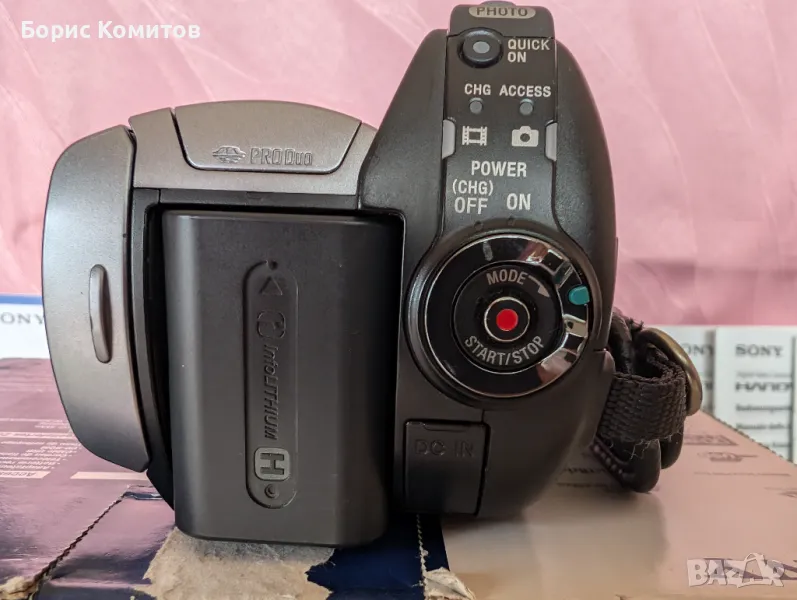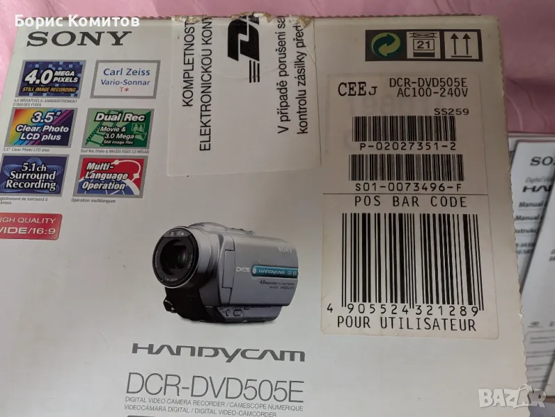 видеокамера SONY DCR-DVD 505 E .Към камерата предлагам чанта , док. станция и много допълнителни аксесоари .ОписаниеDVD, 1/3", 1CMOS, фото режим, увеличение 10x/120x, цветен визьор, MS, MS Duo, 147x66x90 mm, 540 gПодробни спецификацииТипЖивот на батерията1.45 чМатрицаБрой матрици1Матричен типCMOSБрой пиксели на матрицата2,1 MPФизически размер на матрицата1/3"Минимално осветление3 луксаВизьорТип визьорцвятРазделителна способност на визьора123200 пикселаекранLCD екран с диагонал3,5"Резолюция на LCD екрана211200 пикселаСтабилизаторТип стабилизатор на изображениетоелектроненОбективОптично увеличение10 хЦифрово увеличение120Фокусно разстояние на обектива, мин5,1 ммФокусно разстояние на обектива, макс51 ммДиафрагма при мин. фокусно разстояние1.8Диафрагма при макс. фокусно разстояние2.9Еквивалентно фокусно разстояние (16:9), мин.41.3Еквивалентно фокусно разстояние (16:9), макс.485Еквивалентно фокусно разстояние (4:3), мин.37.9Еквивалентно фокусно разстояние (4:3), макс.445Диаметър на филтъра30 ммЕкспозицияСкорост на затвора, мин0.0023529 sСкорост на затвора, макс0,33 сФото режимМаксимална резолюция на снимката X2304Максимална резолюция на снимката Y1728 гКарти с паметТип карта с паметMS, MS DuoРазмери/теглоТегло540 грширина147 ммДълбочина66 ммВисочина90 ммДопълнителноОсобеностиLCD екран, визьор, запис на карта памет, ръчен фокус, сензорен дисплейКонектори и интерфейсиAV вход, AV изход, USB, S-Video вход, S-Video изходОборудванеAC адаптер AC-L200, батерия NP-FP60, USB и AV кабел, дистанционно управление RMT-835, софтуер (Picture Package / Nero Express 6), USB тъчскрийн сензорен LCD екран..Допълнителна информацияОбектив Carl ZeissЧесто търсен .