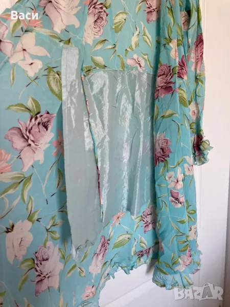 Флорален летен плат с подплата е долната част и романтични къдрици на ръкавите и полата.