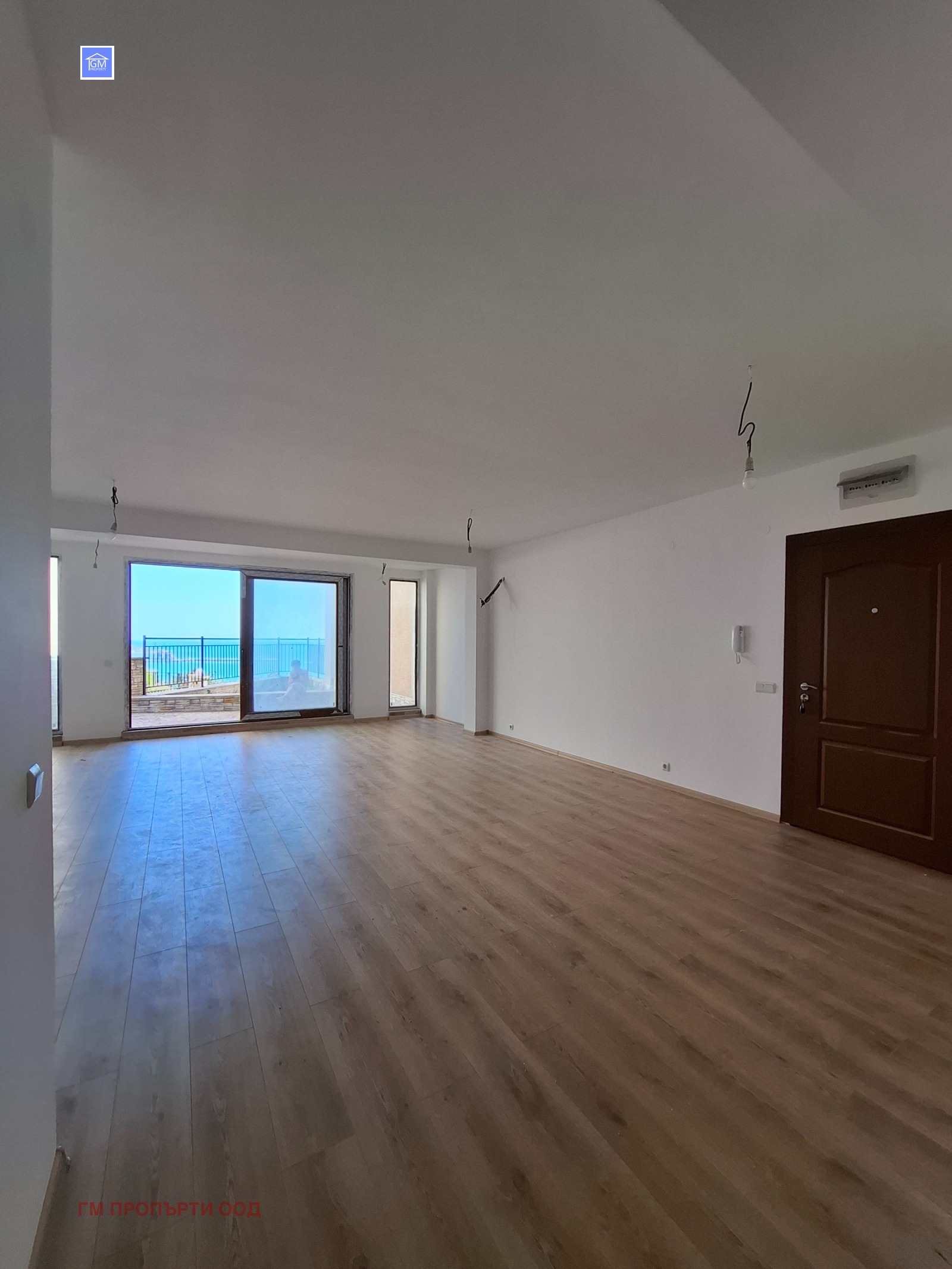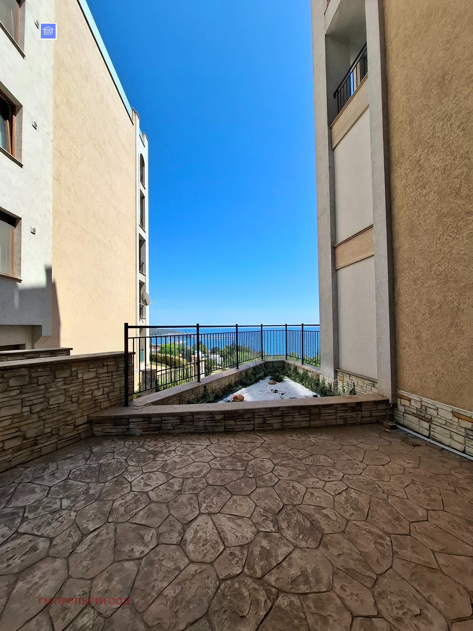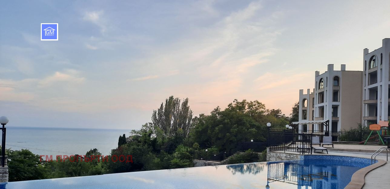 Апартаментът състои от просторен дневен тракт с кухненска част с изглед -морска панорама , две спални, баня с тоалет, просторна тераса -тип английски двор с излаз към басейн